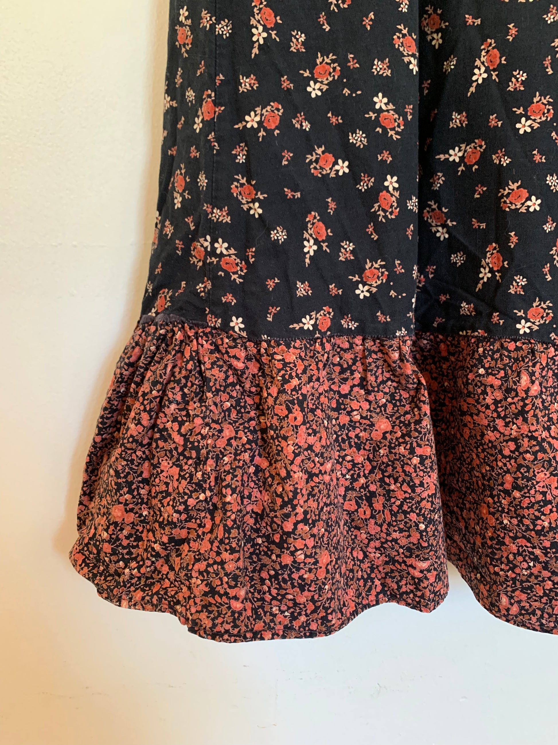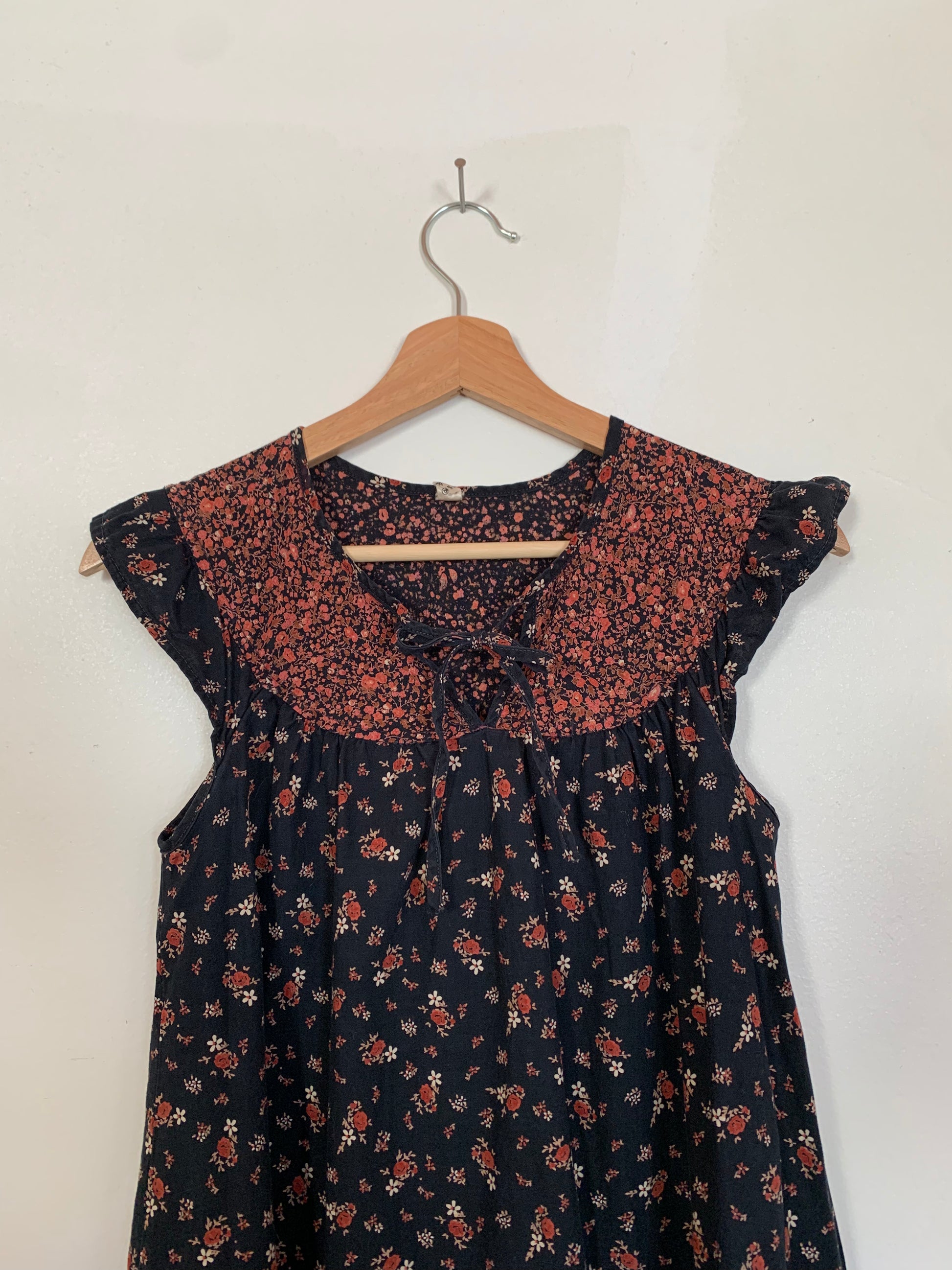100% cotton gathered smock dress with tie front and flutter sleeves. European made with ditsy rust and cream florals on black background.