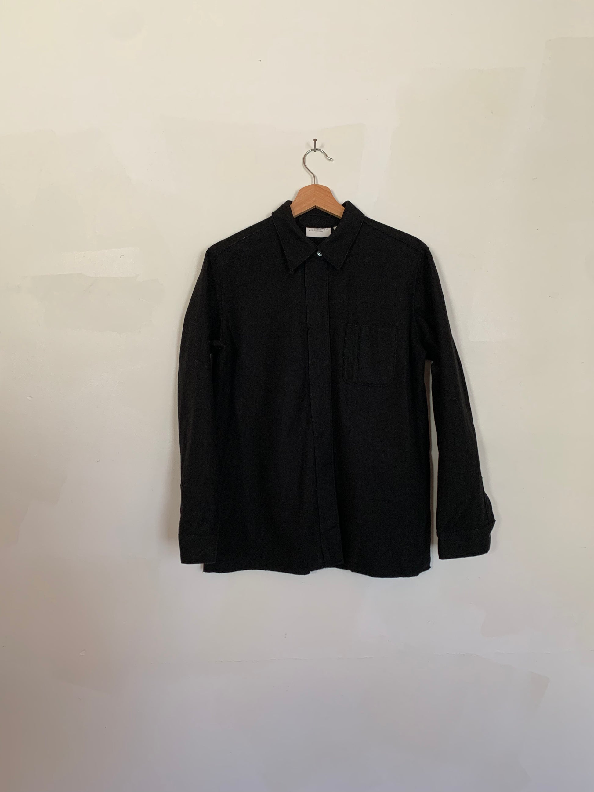 Black Liz Claiborne button-up shacket (hidden buttons). 65% Wool, 25% nylon, and 10% cashmere. Very structured.